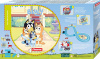 Carrera FIRST 2,9 m hosszú autópálya Bluey és Bingo autókkal, 3 éves kortól, elemekkel működik, egyenes szakaszokat, kanyarokat, kaput tartalmaz a nagyobb szórakozásért, Bluey és Bingo témájú vezérlőket és dekorációkat.